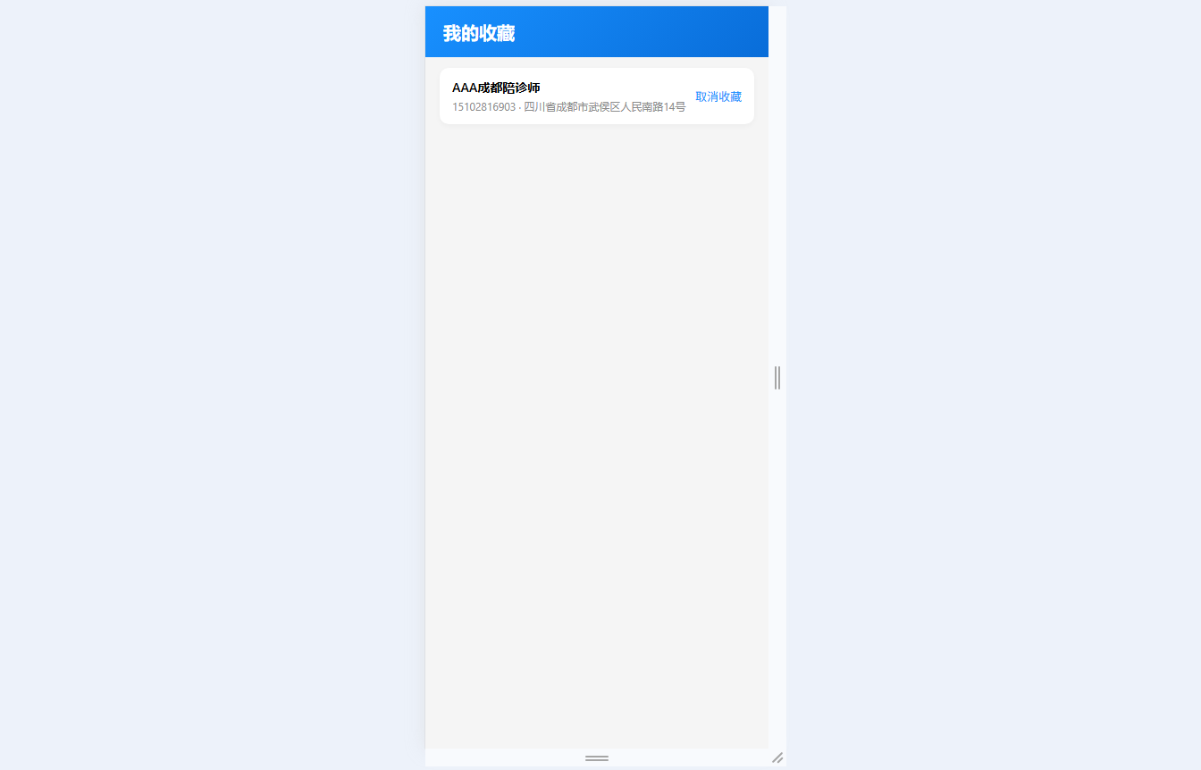 ● 收藏与记录联动:列表/详情页均可收藏陪诊师并同步至“我的收藏”,下单记录自动同步到预约与历史记录,方便回溯