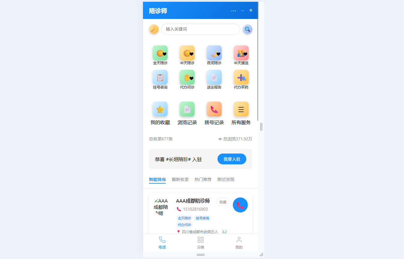 ● 陪诊师列表与搜索:支持姓名/地址等关键字搜索,多维度排序(智能/最新/热门/附近),展示陪诊师核心信息,一键拨号、收藏及跳转详情页