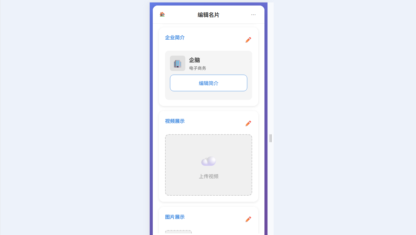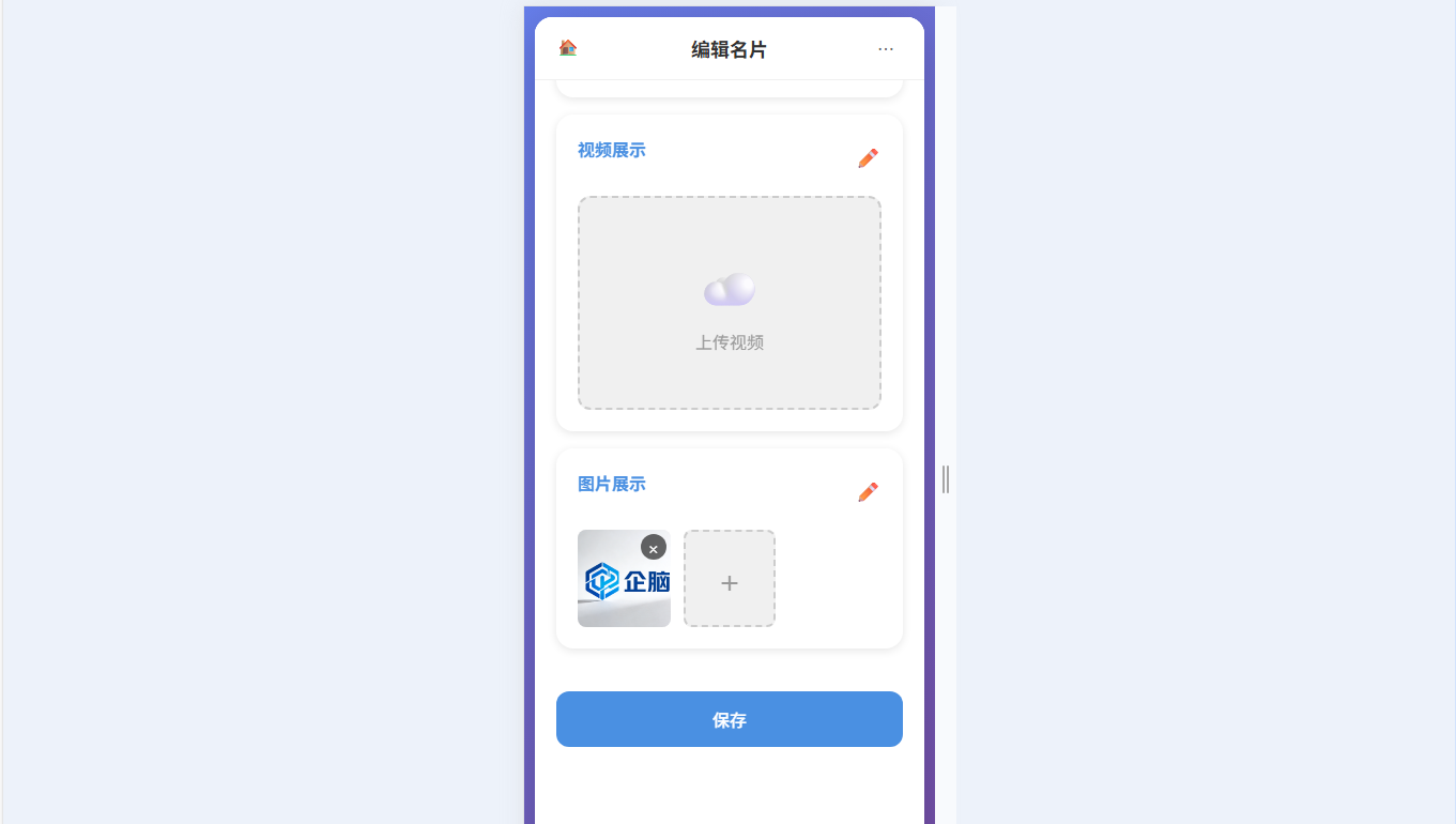 ● 支持名片视频/图片素材的上传、编辑与管理