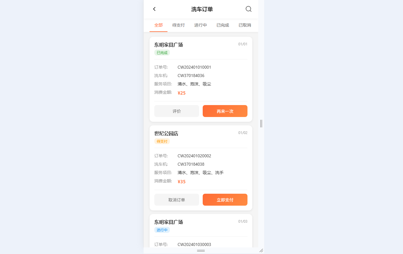 全流程订单管控(状态筛选、支付取消、评价反馈)