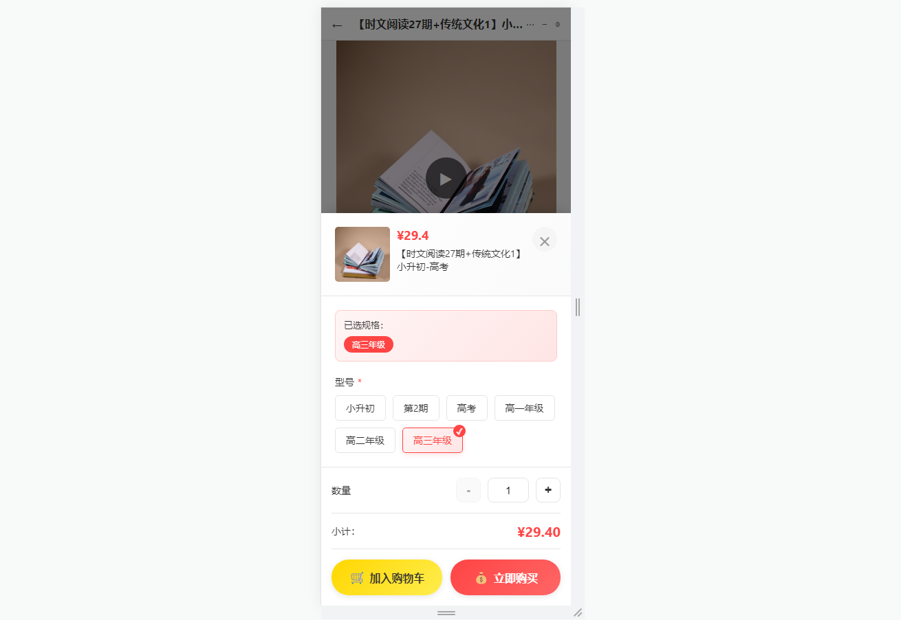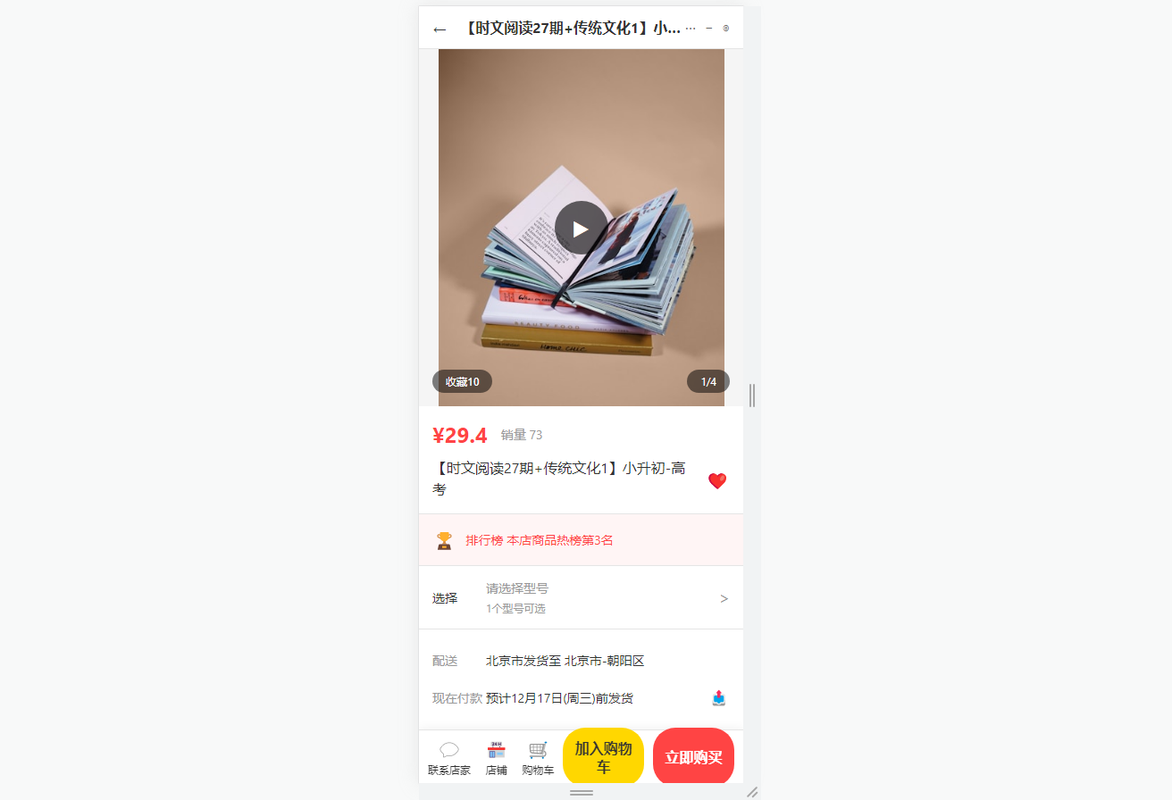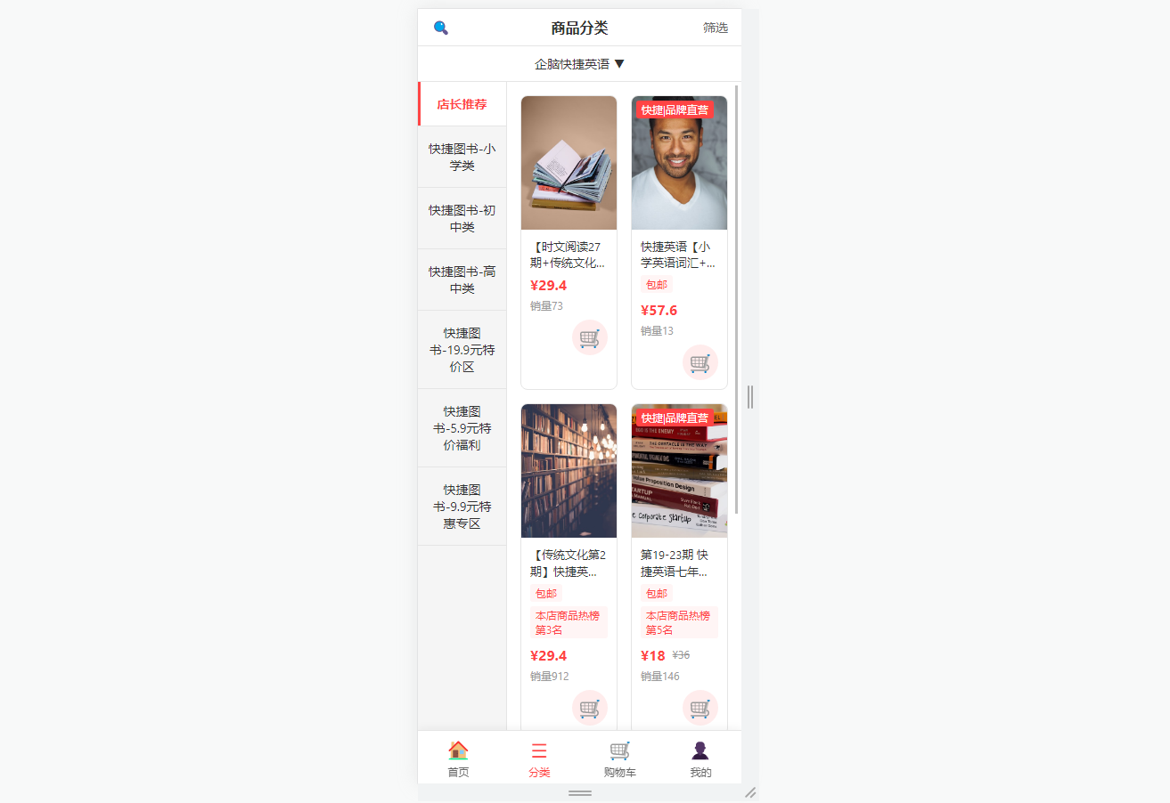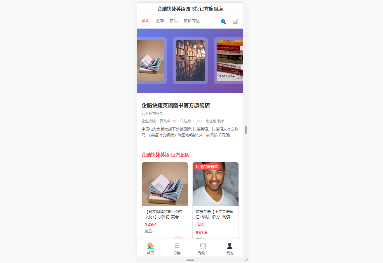 ● 商品浏览与搜索:首页展示热门英语学习图书,分类导航清晰,详情页呈现高清图片、多规格选择及完整商品信息