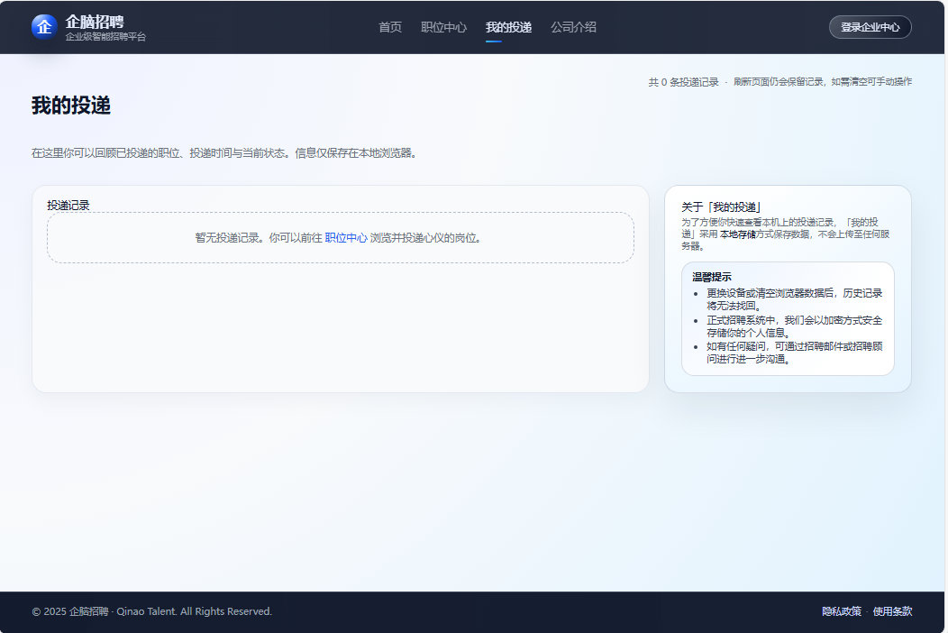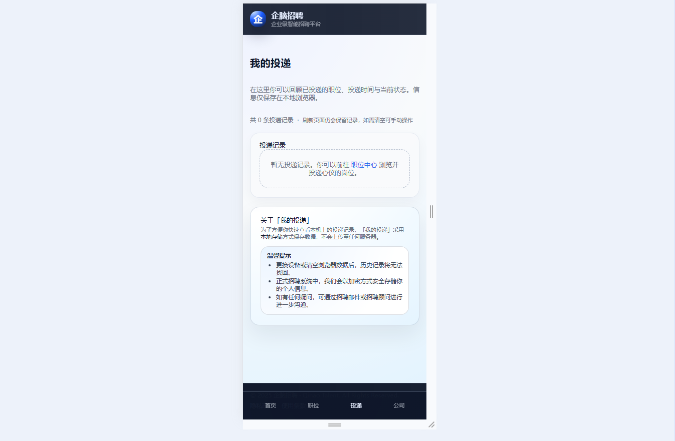 ● 候选人自助查询:本地展示投递记录(时间、职位编号等),支持清空记录保护隐私,方便候选人自查投递状态