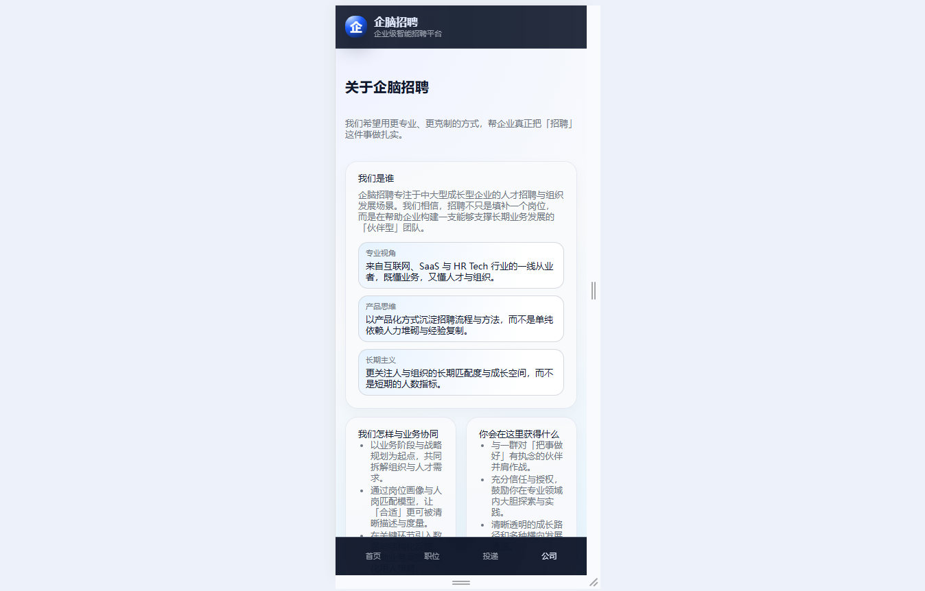 ● 雇主品牌展示:介绍公司定位、价值观与人才发展资源,构建专业的雇主品牌形象,吸引优质候选人