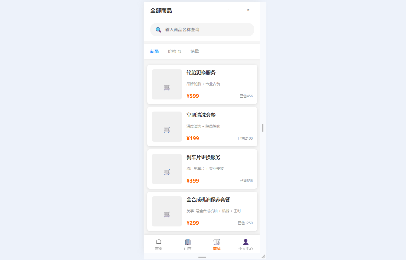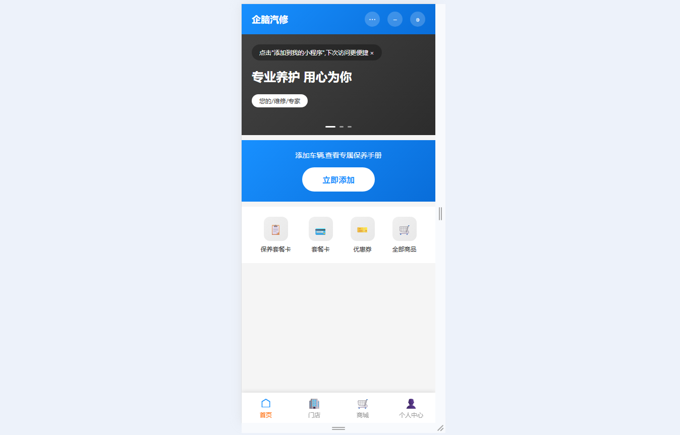 ● 首页分类导航:快速访问保养套餐卡、优惠券、全部商品等核心服务入口,整合车辆管理与保养提醒核心功能