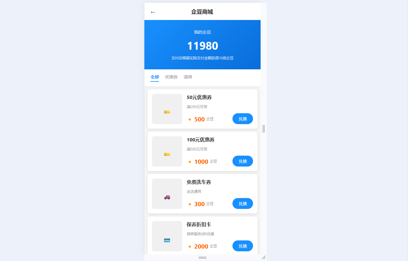 ● 企豆商城兑换:消费获10倍企豆,实时显示余额,可兑换各类优惠券、VIP体验卡、保养折扣卡等商品,支持分类浏览兑换列表