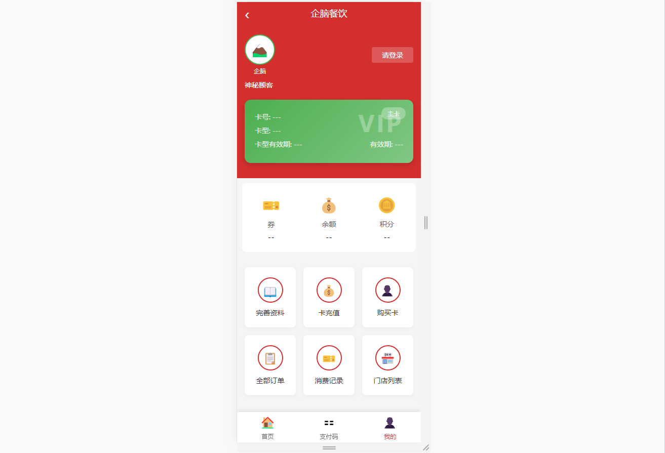 ● 个人中心管理:展示用户头像、VIP卡片、余额积分,提供完善资料、卡充值、门店列表等功能入口,支持登录/退出操作