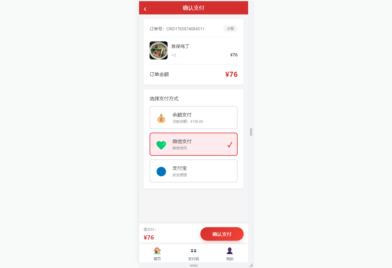 ● 多渠道支付系统:支持余额、微信、支付宝三种支付方式,支付弹窗清晰展示金额与方式,支付成功后弹窗提示并跳转订单列表