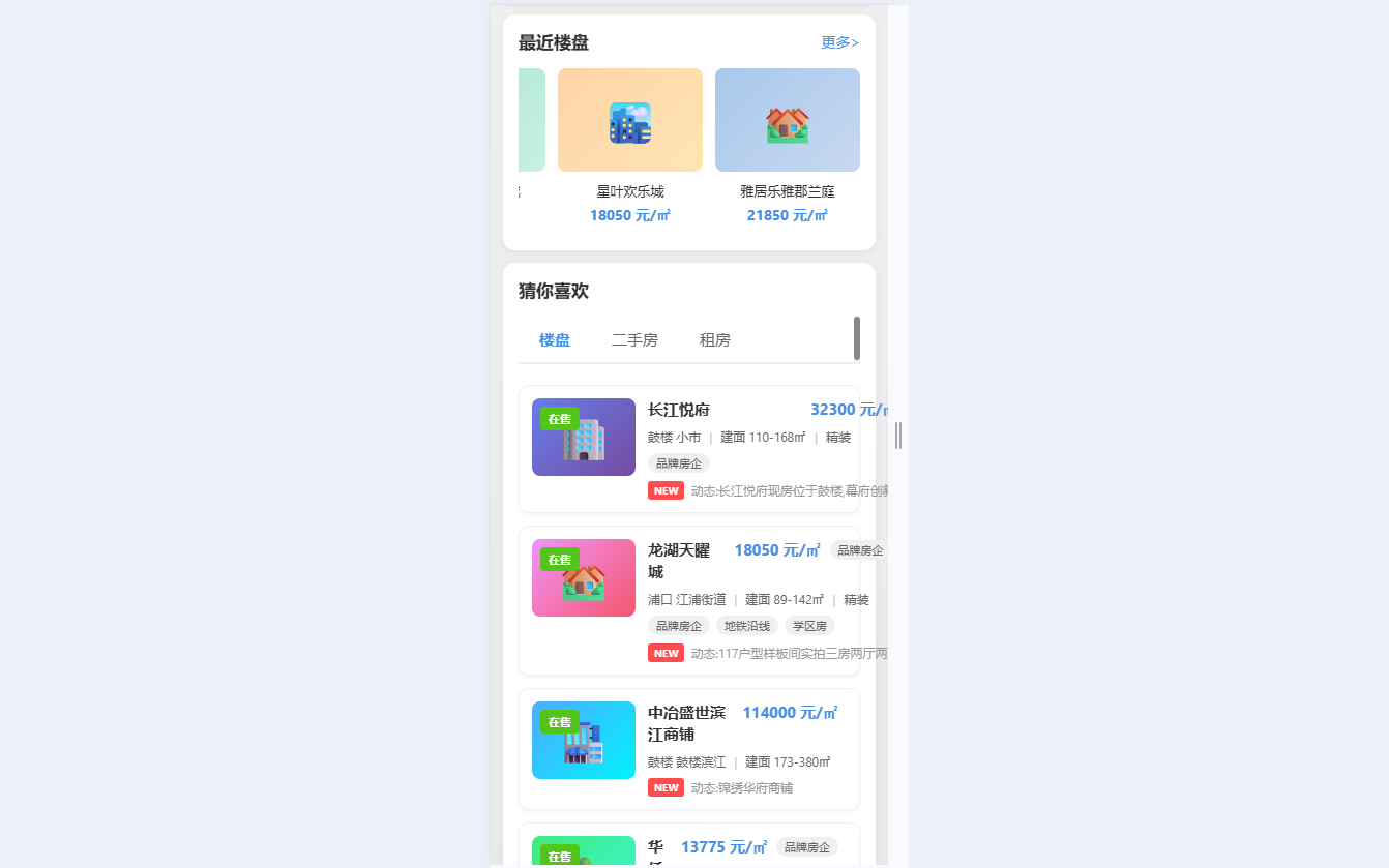 ● 智能推荐系统 基于用户浏览习惯实现猜你喜欢个性化推荐 分楼盘二手房租房三类展示房源 推荐内容实时刷新贴合用户需求