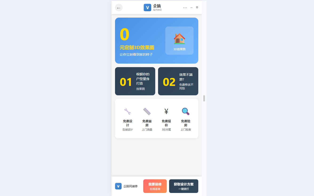● 一站式装修服务 提供0元定制3D效果图服务 支持在线免费设计和实时查看装修效果 可根据户型量身打造方案并免费修改 配套免费量房报价验房服务 提供一对一装修顾问咨询