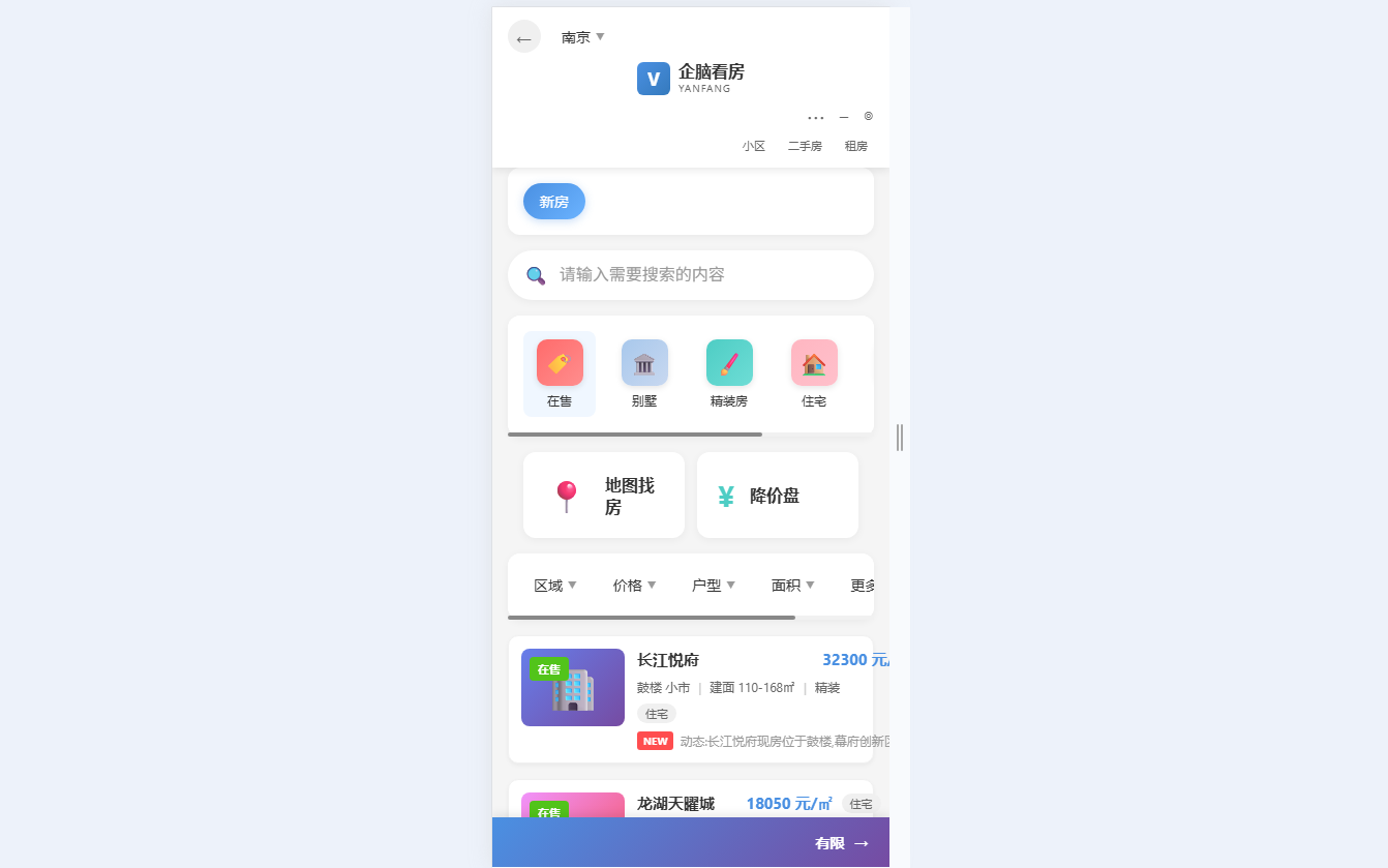 ● 多类型房源浏览 涵盖新房二手房租房三大品类 新房展示最新楼盘信息和价格动态 二手房呈现面积户型装修等详细内容 租房提供海量房源和租金交通信息