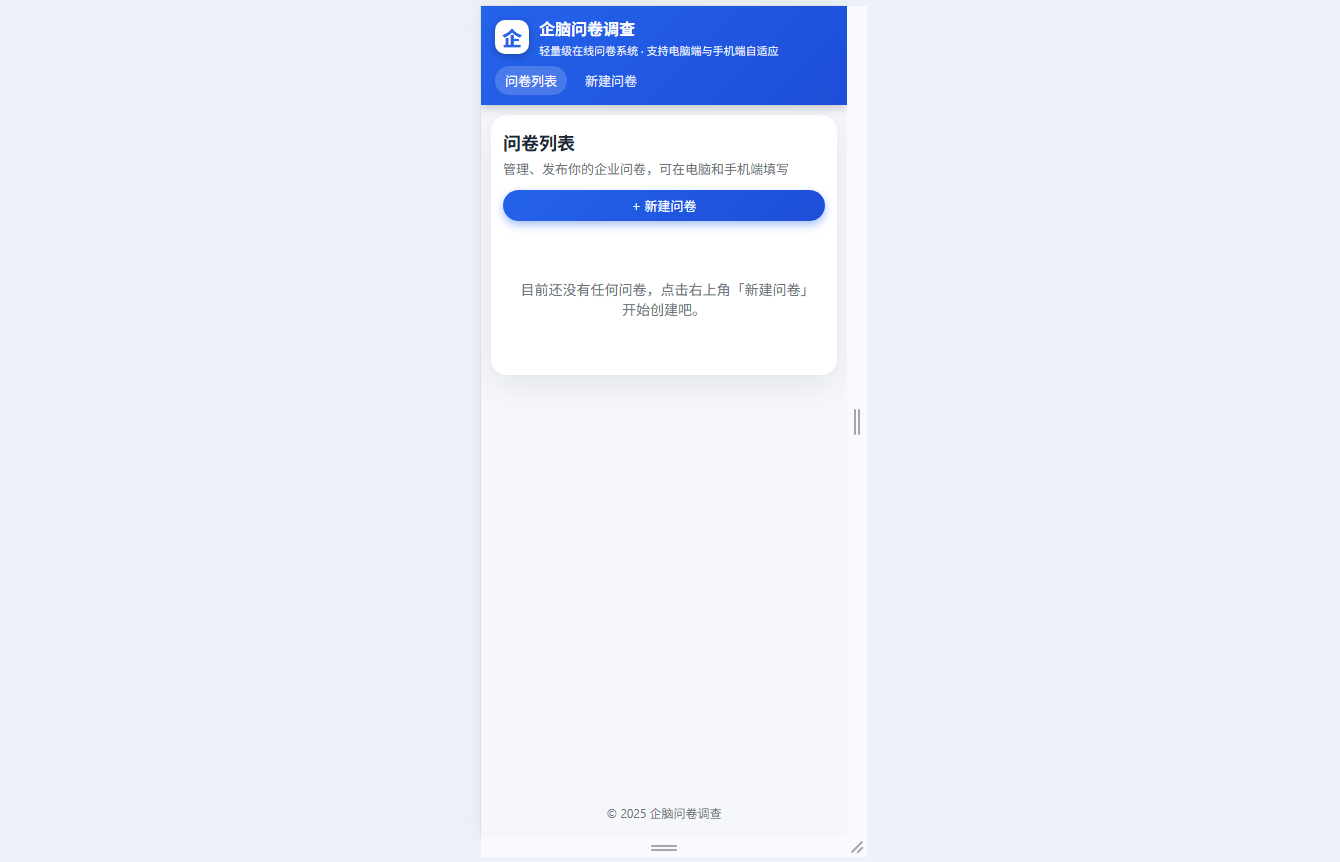 ● 问卷管理:集中展示问卷标题、状态、答卷数等信息,支持草稿/发布/关闭状态切换与问卷安全删除,同步清理答卷数据