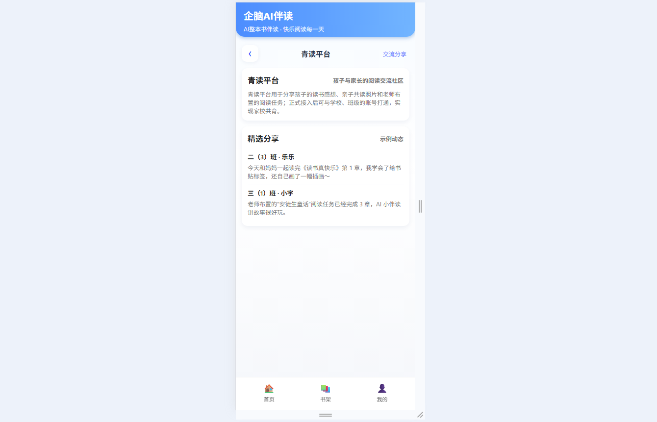 ● 儿童友好设计:移动端卡片式UI布局,轻量操作路径,重点突出“开始伴读”与“随时提问”核心功能,适配孩子操作习惯