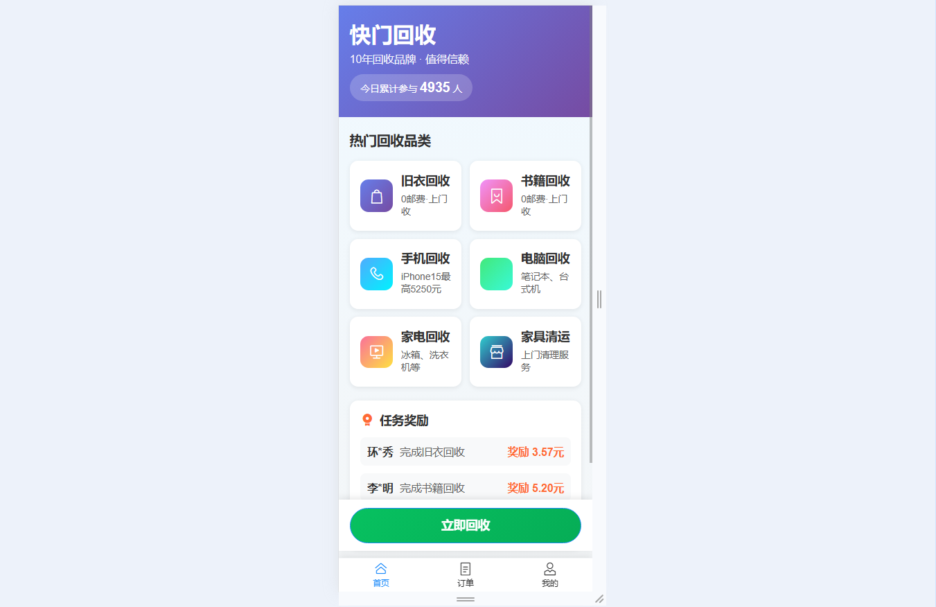 ● 移动端体验优异:完美适配各类手机屏幕,响应式设计保障流畅交互,底部导航栏快速切换功能,回收流程直观易懂