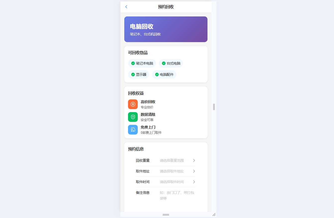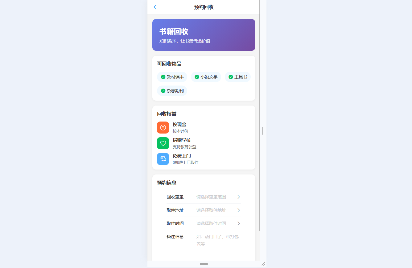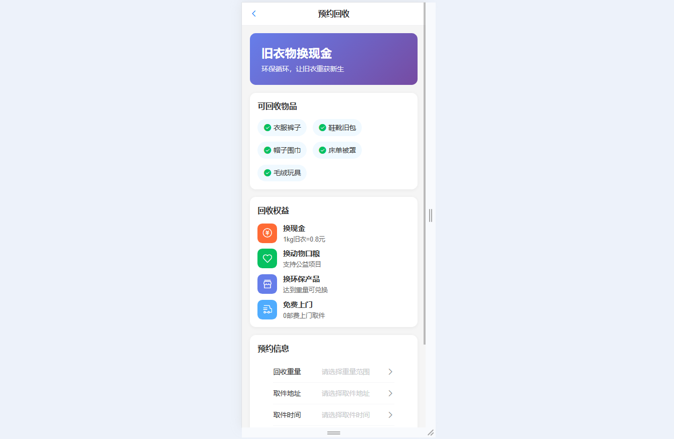 ● 预约回收服务:选择回收品类与可回收物品,支持换现金/公益/环保产品等权益,填写回收重量、地址、取件时间与备注信息完成预约