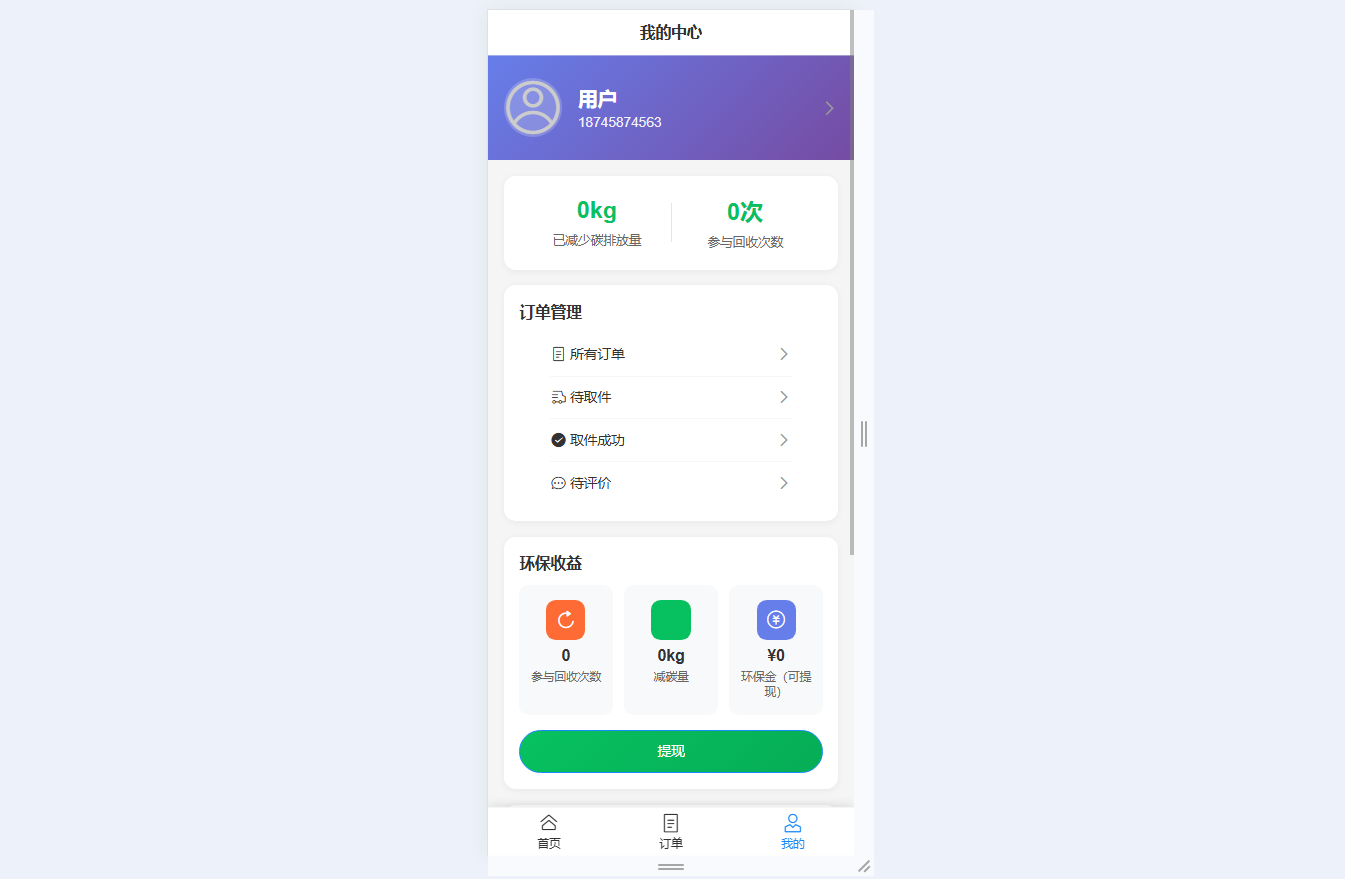 ● 个人中心管理:登录注册后查看减碳量、回收次数等环保数据,管理环保金(可提现),参与分佣活动邀请好友获利,快速访问各类服务入口