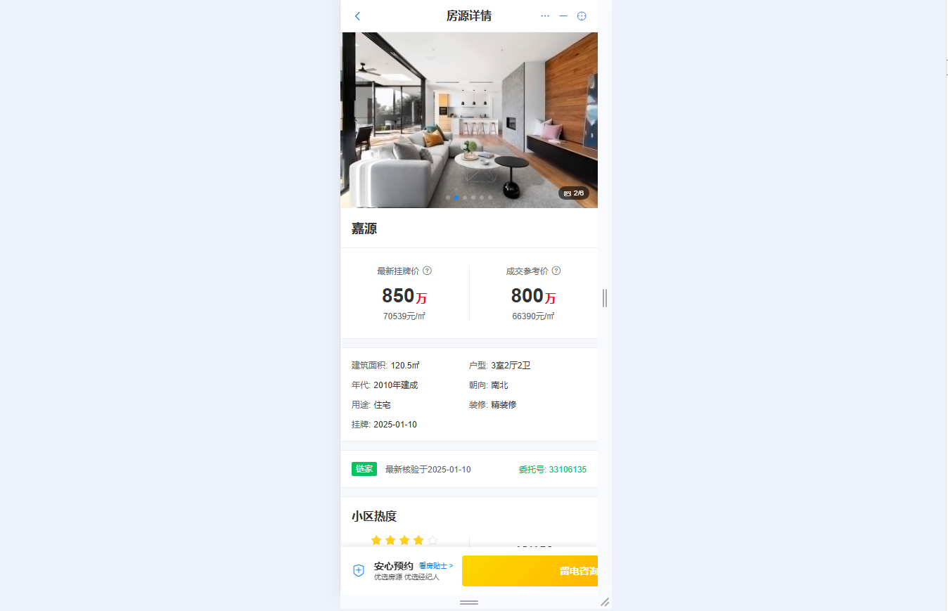 ● 房源详情展示:图片轮播+全屏预览功能,实时显示图片位置,高亮展示最新挂牌价与成交参考价,同步显示单价,完整呈现户型、装修等详细信息,展示小区热度星级与成交排名