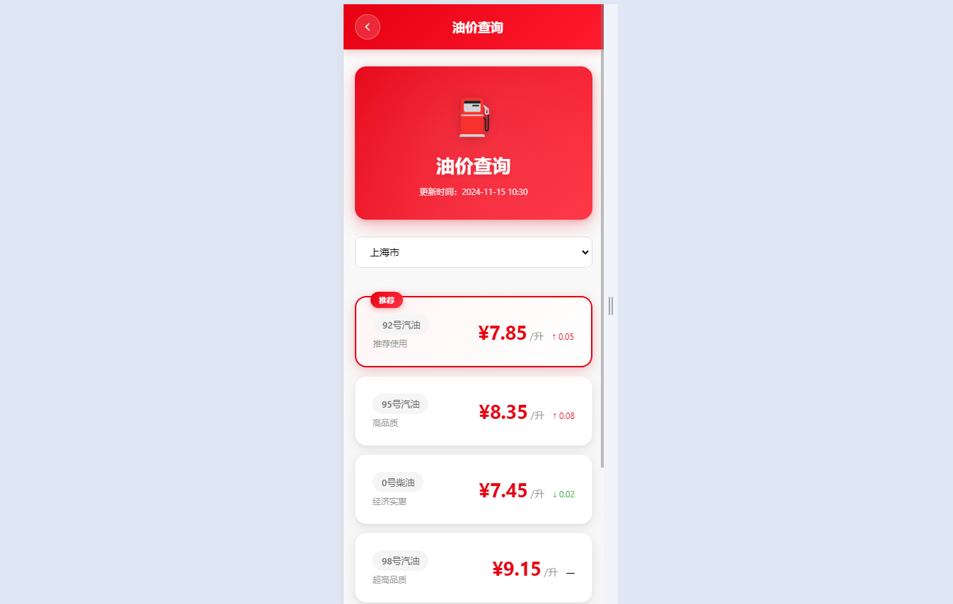 ● 油价查询 提供92号95号98号汽油0号柴油实时价格 展示价格变动趋势 生成历史价格走势图表 显示涨跌幅度 标注推荐油品