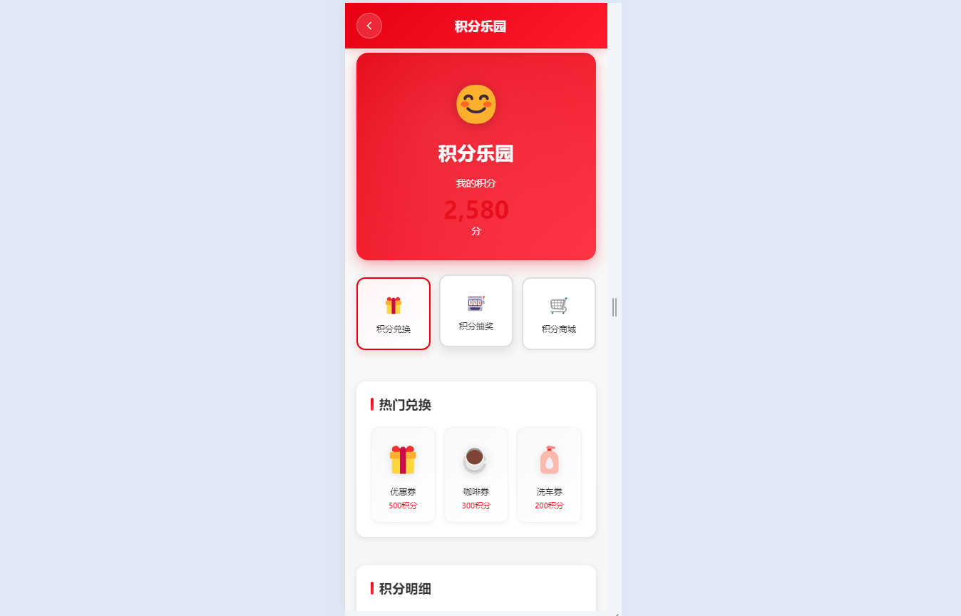 ● 积分乐园 开展积分兑换抽奖活动 接入积分商城 热门兑换项目包含优惠券咖啡券洗车券 可查询积分消费获得兑换消费签到获得等明细记录