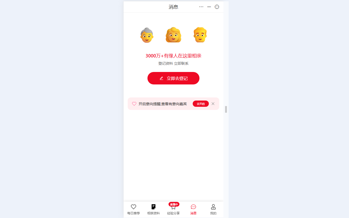 ● 消息互动中心 提供即时聊天功能,支持与匹配对象沟通,开启意向提醒查看有意向的相亲者
