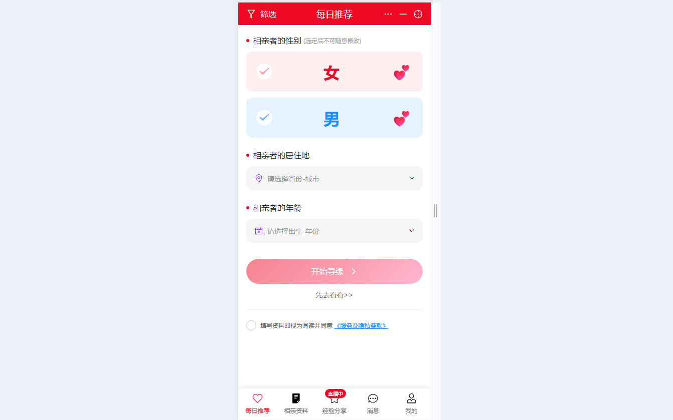 ● 个性化筛选 可选择相亲者性别、居住地、出生年份,设置后精准匹配符合要求的对象