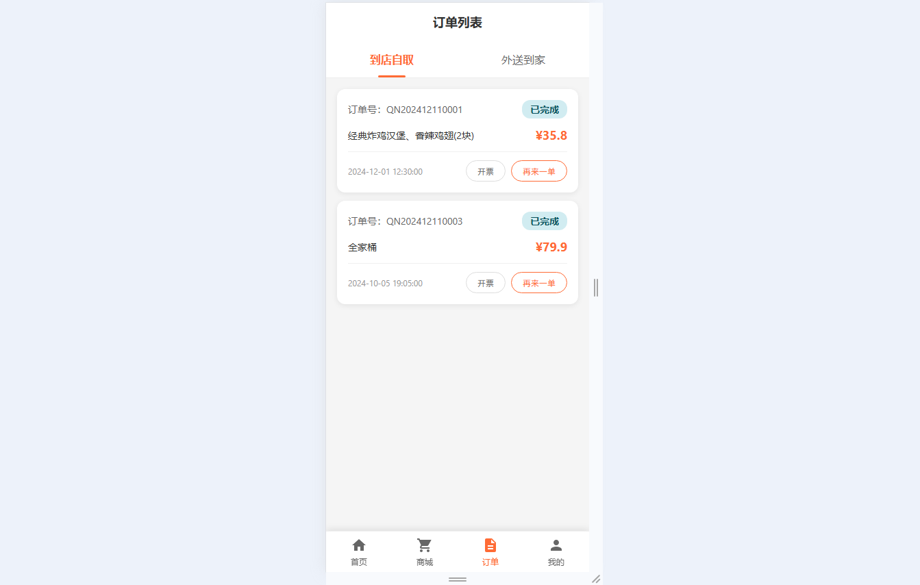 ● 订单管理 分“到店自取/外送到家”展示订单列表,可查看订单明细、申请开票,支持“再来一单”快速复购