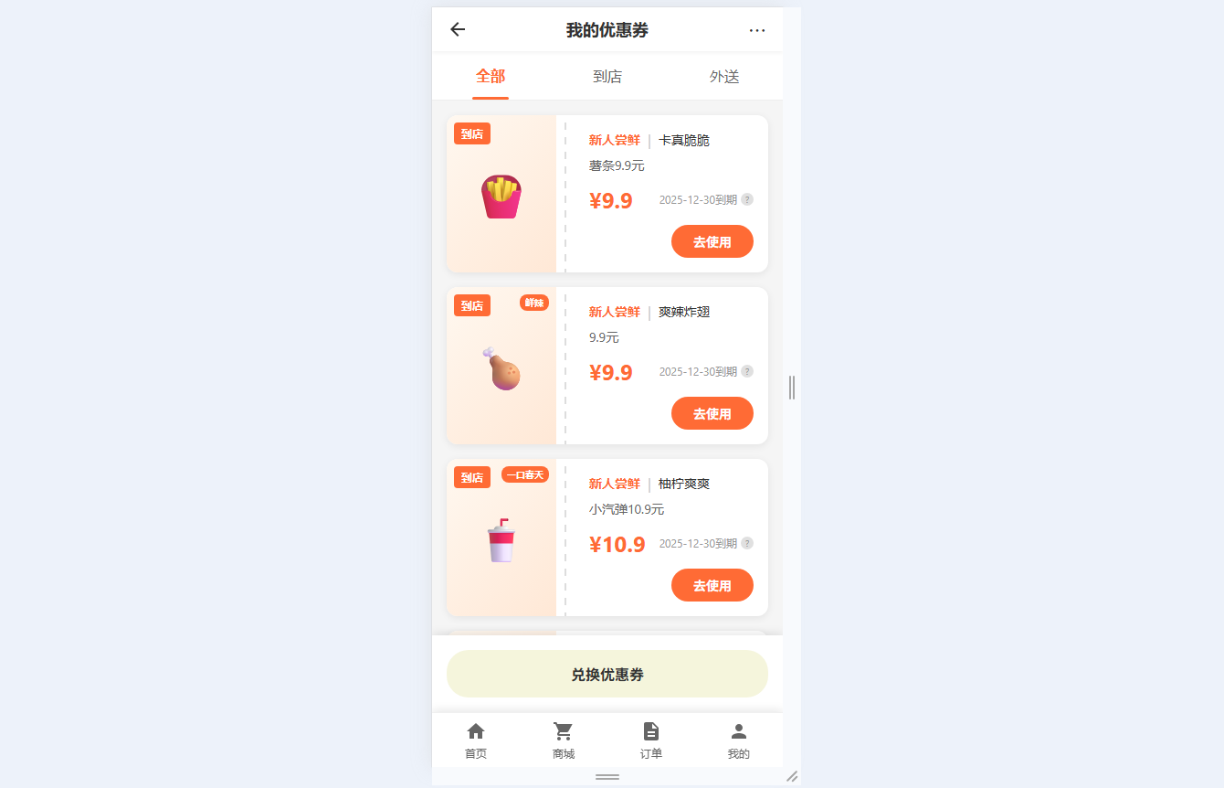 ● 优惠券运营 分类展示到店/外送优惠券,标注优惠金额、有效期,支持“去使用”快捷操作,提供积分兑换优惠券入口
