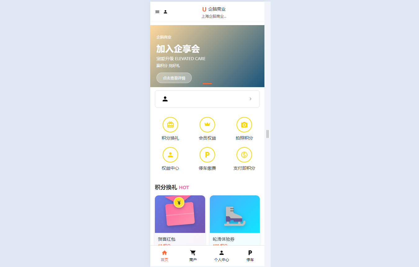 ● 首页综合服务 轮播图展示商业活动企享会招募积分换礼等内容 提供用户登录入口 集成积分换礼会员权益停车缴费等功能快捷入口 展示热门积分礼品并支持兑换