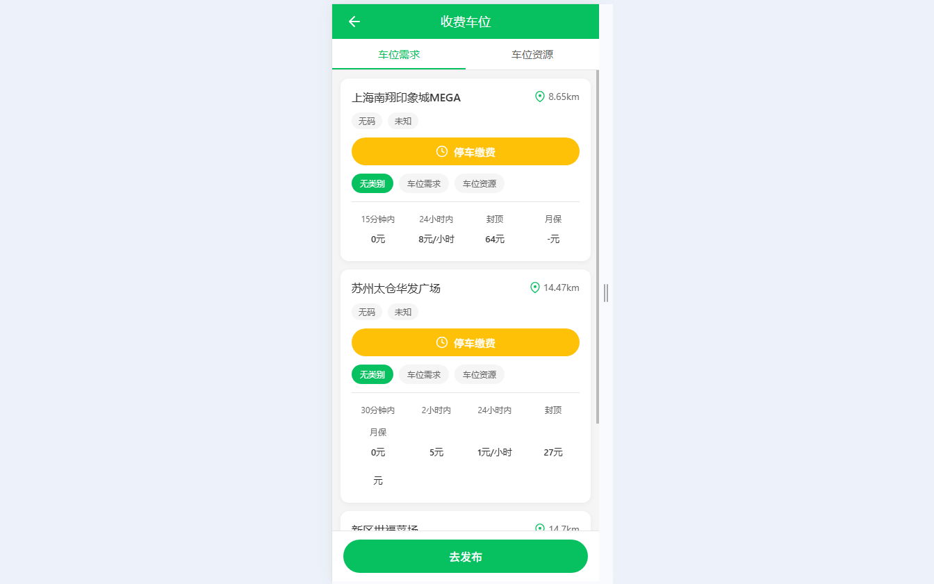 ● 车位发布功能 可发布免费/收费车位,免费车位录入基础信息并地图定位,收费车位支持多时段灵活定价与分类管理