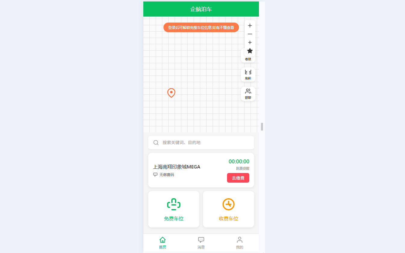● 智能车位查询 实时地图展示周边车位分布,精确定位用户位置,登录解锁完整信息,支持地图缩放、刷新等操作,快速查找合适车位