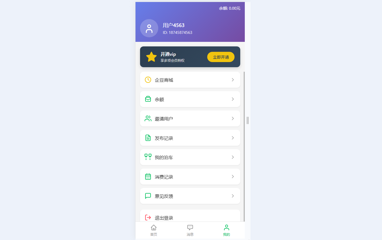 ● 完善用户中心 展示个人信息、余额与VIP状态,集成企豆商城、停车记录、消费明细等功能入口,便捷管理个人资产